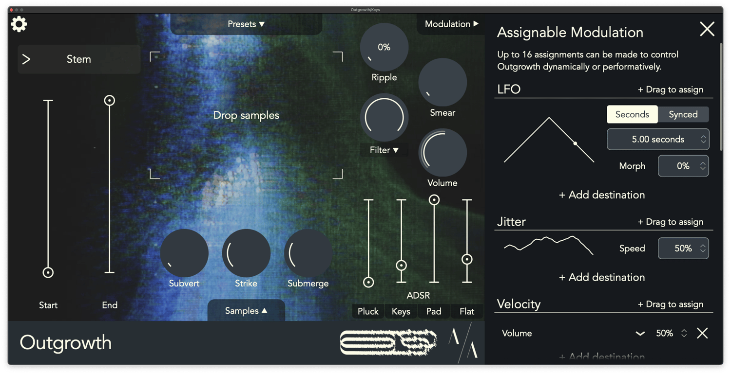 And further still, Outgrowth offers a robust modulation matrix for generative or performative control over all parameters. Control every single parameter within Outgrowth via LFOs, unique random sources, velocity, note pitch, aftertouch, MPE control, and more.